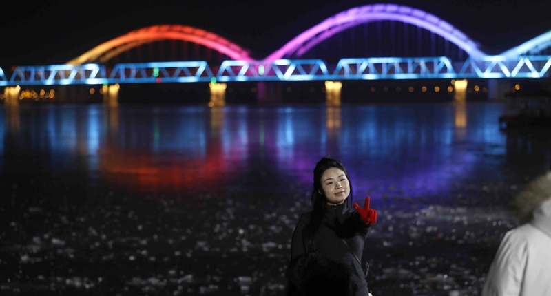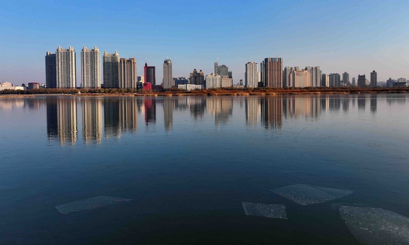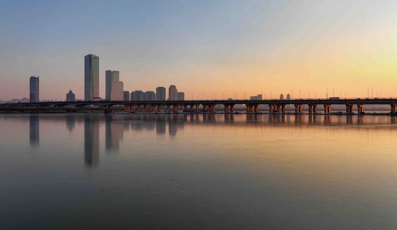 近日,松花江哈尔滨城区段开始结冰。江面新冰晶莹剔透,宛如一面巨大的镜子,静静倒映着江岸的诸多地标。公路大桥的雄伟线条、太阳岛的沧桑轮廓、江上城堡的梦幻造型、太阳桥的现代感、江边高楼时尚气息,都在冰面上清晰呈现,构成一幅如梦似幻的冬日画卷,美不胜收。(记者 张澍 摄影 张澍)