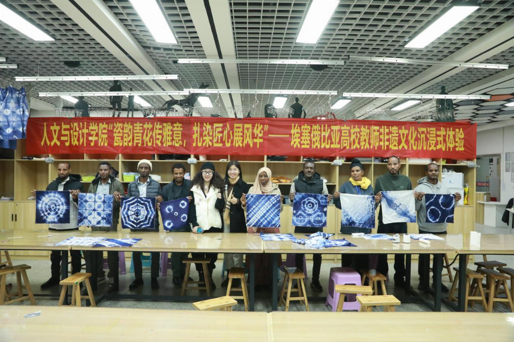 人文与设计学院两位非遗文化专业教师通过“文化讲解+技艺演示+实践体验”形式,让11位埃方教师全方位、沉浸式地感受了青花瓷与扎染两项非遗技艺的深厚底蕴与创作乐趣。首先在青花绘制环节,于吉普老师带领埃方教师认识了解青花瓷器的基本知识,在初步掌握相关技艺后,能够将本国传统纹样融入青花绘制,然后了解绘画、施釉、烧制等工序,逐步完成青花瓷创作;随后,孟立丛老师带领他们又学习掌握了对角折、风琴折等多种布料折叠方法,了解了皮筋捆绑、棉线缠绕技巧和染料调配比例与浸泡时间对色彩效果的影响,完成了一件件色彩斑斓、图案独特的扎染作品。在创作展示与总结阶段,埃方教师分享了从“初识技艺”到“完成创作”的全过程感受,纷纷表示通过本次中国非遗文化沉浸式体验活动,不仅掌握了两项非遗技艺的基本方法,更深刻体会到了中国文化的包容性与创造力。