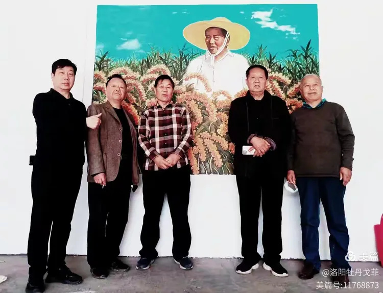 我在荥阳的书画团队领头人们在我创作的毛主席壁画前合影。武建民的壁画,毛主席视察农业大丰收