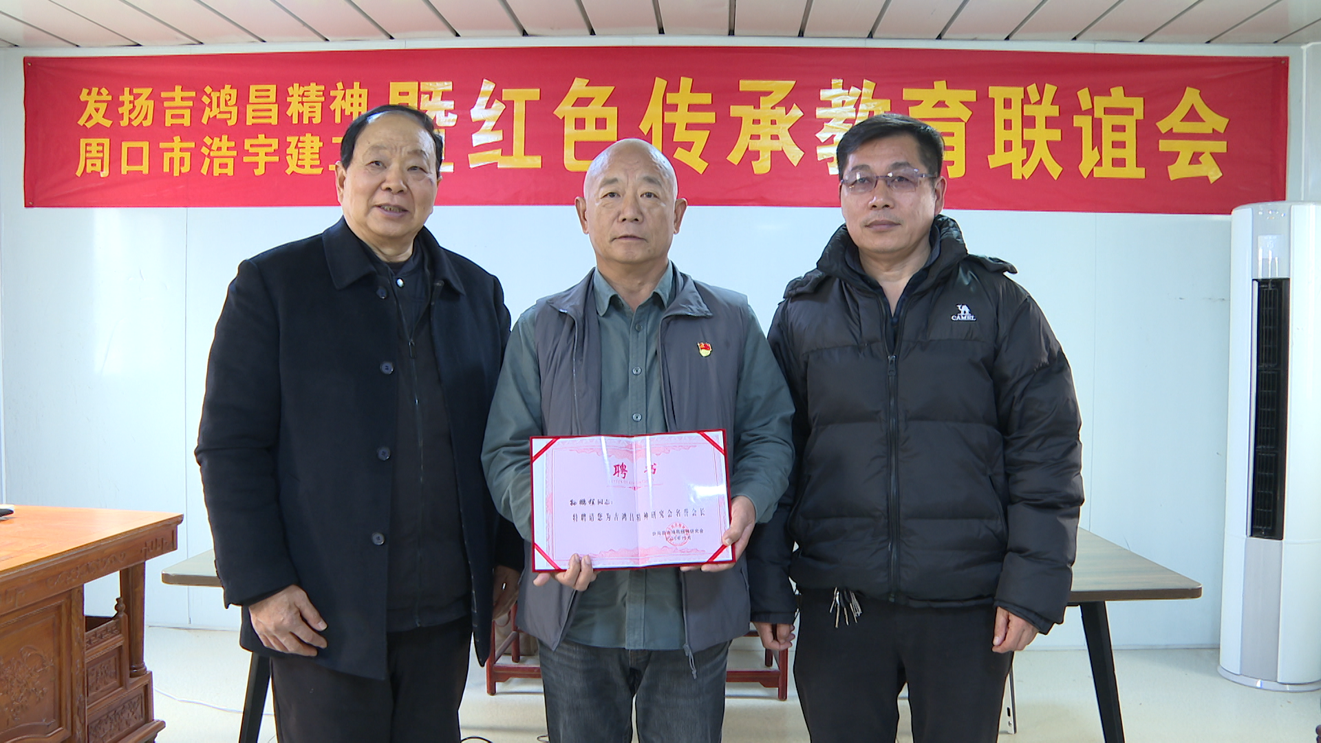 联谊会上,吉鸿昌精神研究会还聘请周口浩宇建工有限公司董事长孙鹏程为名誉会长,并颁发了聘书。吉鸿昌精神研究会还向浩宇建工捐赠了100本《吉鸿昌将军故事集》。