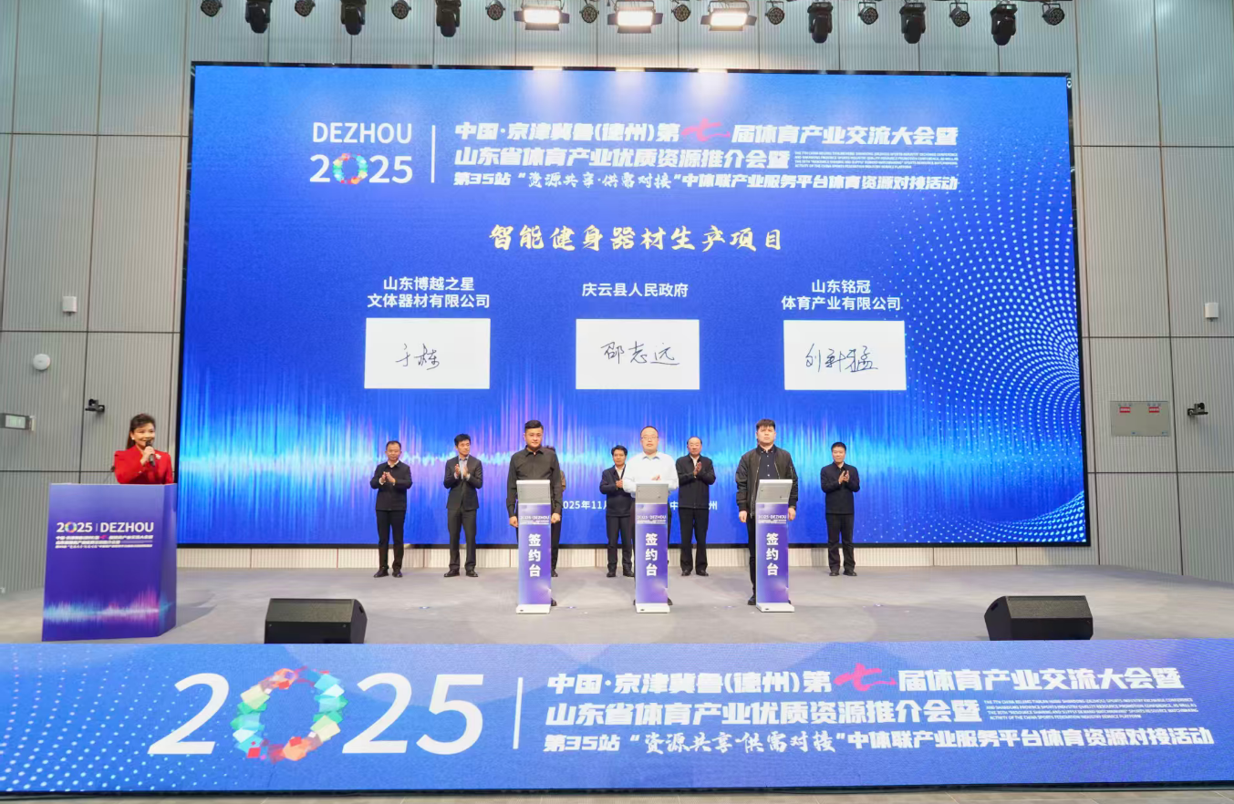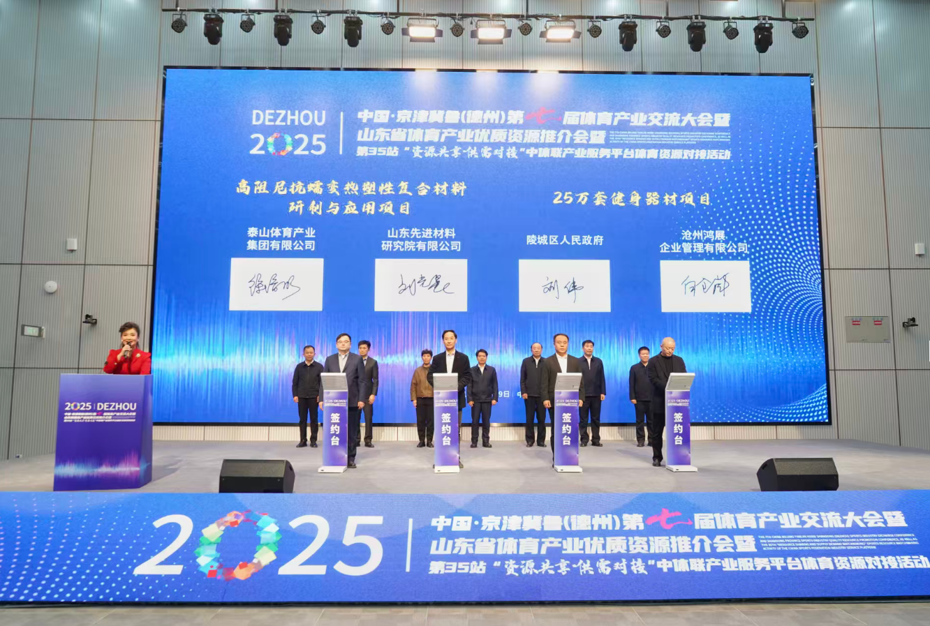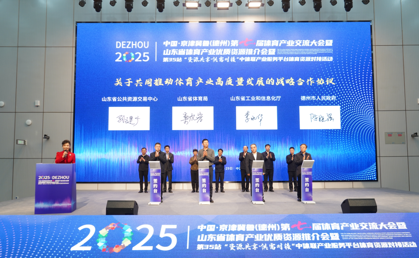 会上,举行了集中签约仪式。省体育局、省工业和信息化厅、省公共资源交易中心与德州市政府签署关于共同推动体育产业高质量发展的战略合作协议。陵城区、庆云县、泰山体育产业集团分别与合作企业签约。